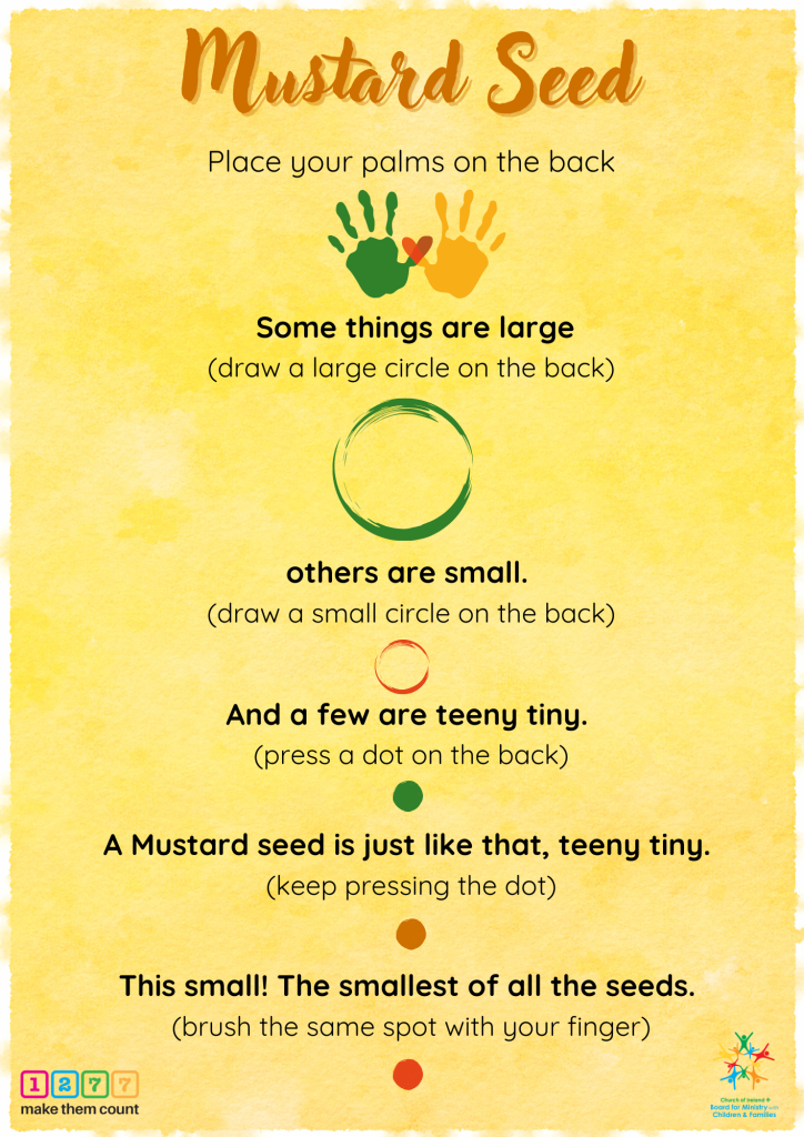 This is an adapted version of the story of the mustard seed, told to help children hear how precious and special they are. Story Massage is a lovely way to tell precious stories to your children and help them to absorb the meanings and blessings into their lives. Using the directions given in the pdf to draw the story on your child’s back if they are comfortable with touch.